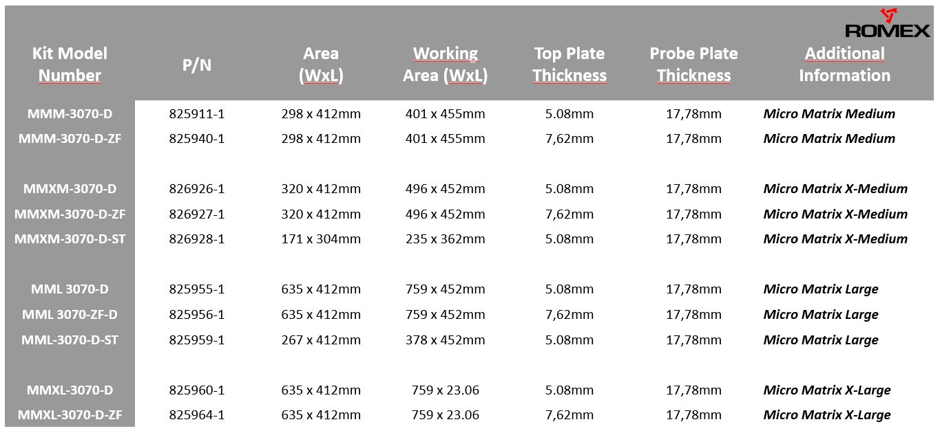 Standard top plates have a 5.08mm (0,20″) thickness, while units with Zero-Flex top plates (ZF) have a 7.62mm (0.30″) thickness. MMM, MMXM, MML and MMXL size units have 17,78mm (.60″) thick probe plates.